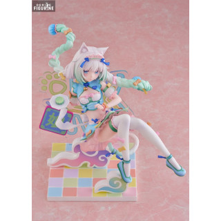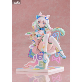 Dans l’univers de Nekopara, les aventures tournent autour de la vie quotidienne de ces adorables catgirls, qui vivent et travaillent dans une pâtisserie. Vanilla, fidèle et posée, est souvent perçue comme un pilier de sérénité dans ce monde pétillant d’énergie. Cette figurine met en avant son côté tendre et mignon, avec des détails minutieux dans son costume orné de rubans, de clochettes et d’un dégradé de couleurs pastels qui évoquent un rêve sucré.