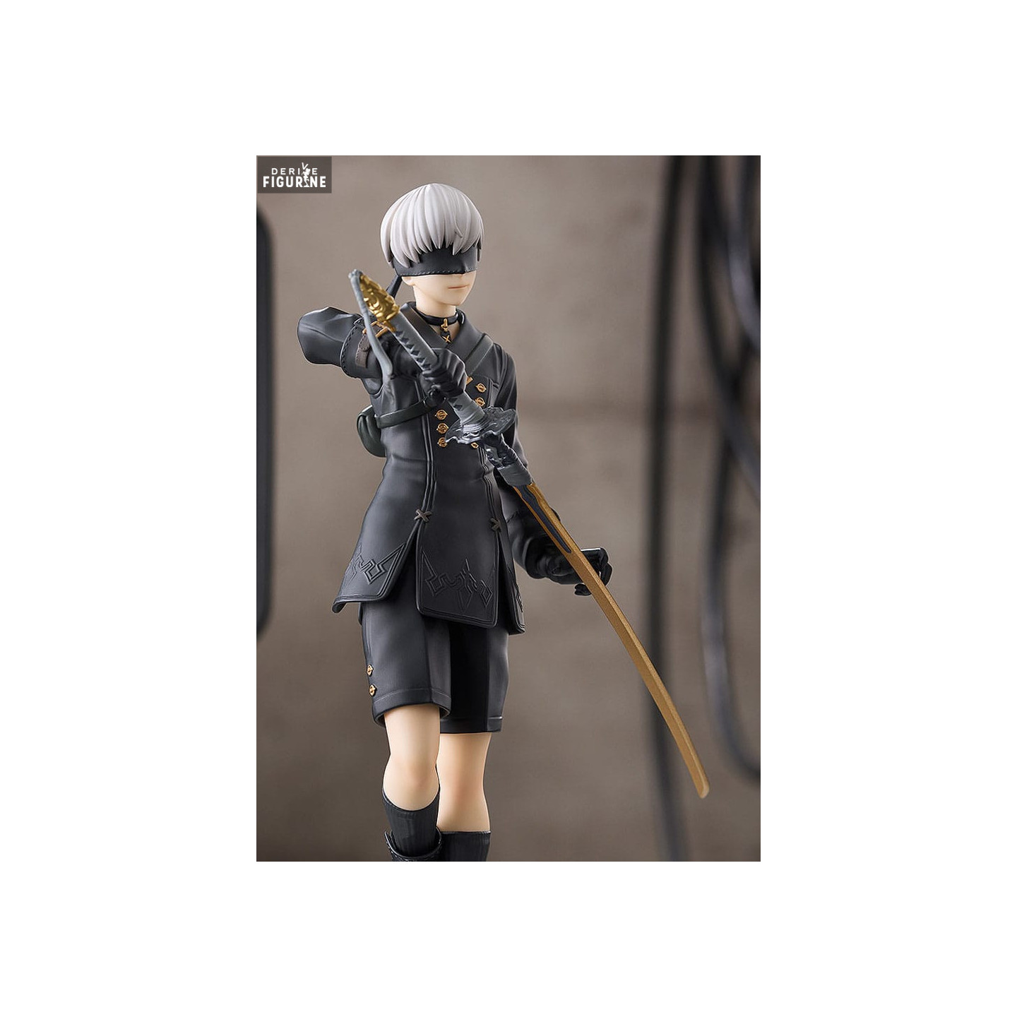 Son visage, partiellement masqué par son bandeau noir, laisse entrevoir une expression sereine et concentrée. Les cheveux argentés de 9S sont également recréés avec soin, capturant les nuances et la texture de sa chevelure. La figurine repose sur une base sobre mais élégante, qui met en valeur la posture et l'attitude de 9S sans détourner l'attention de sa présence charismatique.