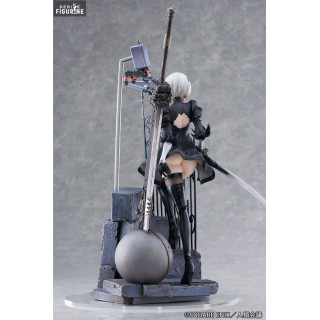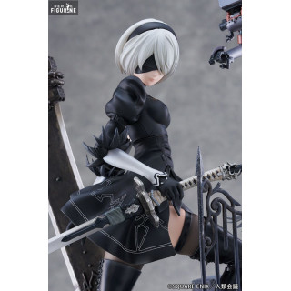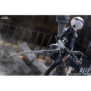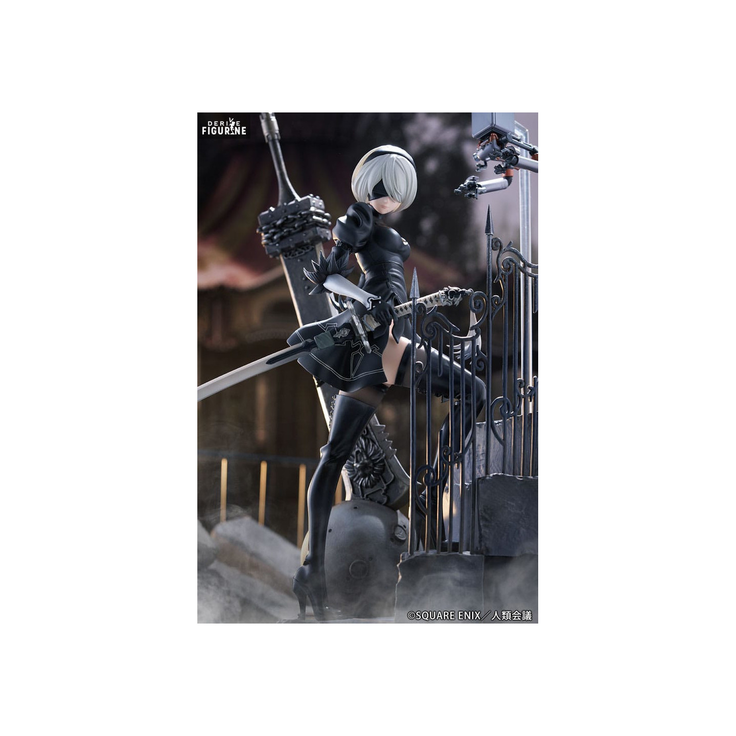 Chaque détail de cette figurine a été minutieusement sculpté pour capturer la complexité du design de 2B. La texture de sa tenue noire en tissu moulant, les détails métalliques de son épée, et les nuances de son visage masqué sont tous réalisés avec une précision exceptionnelle. Le contraste entre les éléments brillants et mats de sa tenue ajoute de la profondeur visuelle, tandis que la base élaborée, incluant des éléments comme une vieille barrière en fer forgé et des gravats, renforce l'immersion dans l'univers de "NieR: Automata".