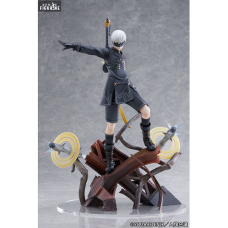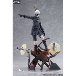 Chaque détail de cette figurine a été soigneusement sculpté pour capturer la complexité et la beauté du design de 9S. Les éléments de sa tenue noire, avec ses motifs complexes et ses accessoires distinctifs, sont fidèlement reproduits. La texture de ses vêtements, la précision des détails sur ses bottes et son bandeau, et la finesse de son arme sont tous réalisés avec une grande précision. La base de la figurine, comprenant des débris métalliques et des éléments de décor futuristes, ajoute une dimension supplémentaire et renforce l'atmosphère immersive du jeu.