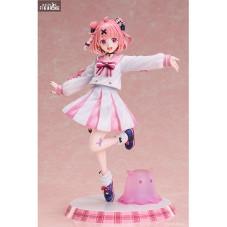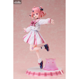 L'attention aux détails dans cette figurine est impressionnante. Les plis de sa jupe, les textures de ses vêtements et les petits accessoires sont tous finement sculptés et peints avec soin. La présence de son petit compagnon mascotte, représenté sous la forme d'une créature fantomatique rose, ajoute une touche supplémentaire de charme et de fantaisie à la figurine. Le socle décoré complète l'ensemble, offrant une base stable et élégante pour exposer Sasaki Saku.