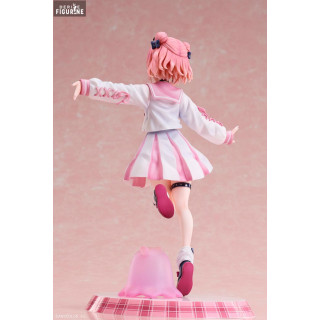La figurine montre Sasaki Saku dans une pose joyeuse et énergique, avec un large sourire qui reflète sa personnalité rayonnante. Elle porte un uniforme scolaire rose et blanc, orné de nombreux petits détails comme des rubans et des accessoires adorables, qui ajoutent une touche de fantaisie à l'ensemble. Ses cheveux roses sont finement sculptés, avec des mèches qui bougent avec son mouvement, capturant l'essence de son design animé.