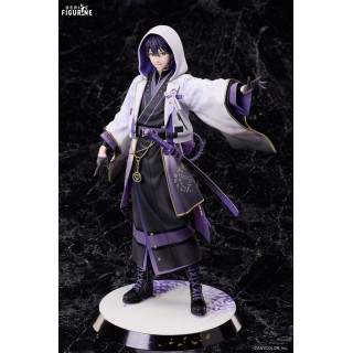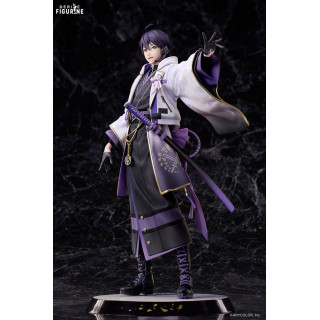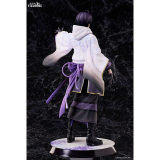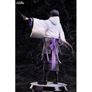 La figurine représente Kenmochi Toya vêtu d'un kimono élaboré, orné de motifs délicats et de bordures dorées. La combinaison de couleurs, principalement violettes et noires, accentue l'élégance et la sophistication de son apparence. Les détails minutieux, tels que les accessoires, les plis du vêtement et les textures variées, sont magnifiquement sculptés et peints, ajoutant de la profondeur et du réalisme à la figurine.