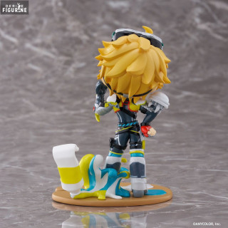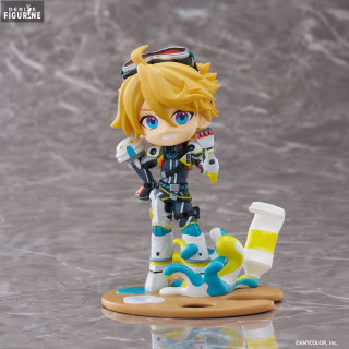 La figurine est sculptée avec une grande précision, mettant en valeur les textures et les couleurs vibrantes de son costume. Les cheveux blonds de Yu Q. Wilson sont minutieusement sculptés, avec des mèches qui ajoutent du mouvement et de la vie à la figurine. Ses grands yeux violets et bleus, caractéristiques du style chibi, captent immédiatement l'attention et ajoutent une touche de charme à l'ensemble.