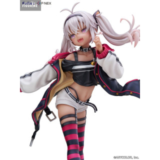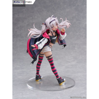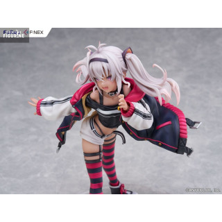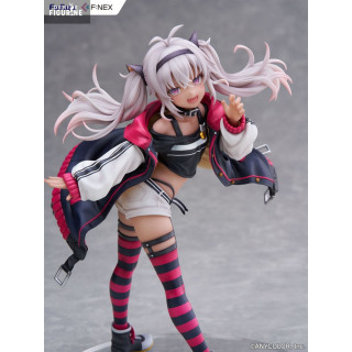 Matsukai Mao est connue pour son attitude enjouée et son charisme débridé, et cette figurine rend hommage à ces traits avec un design qui évoque immédiatement sa personnalité audacieuse. Elle porte une tenue moderne et décontractée composée d'un blouson ample noir et rose, avec des rayures blanches, qui flotte derrière elle comme si elle était en plein mouvement. Ses chaussettes rayées noires et roses et ses bottines modernes ajoutent une touche de style qui complète son look dynamique. Ses longs cheveux blancs, ornés de mèches violettes, sont capturés dans un mouvement fluide, amplifiant l'impression de vivacité.