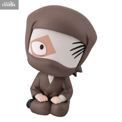 La figurine le représente accroupi, dans une pose simple et compacte, typique de la collection. Son visage couvert presque entièrement par des bandages ne laisse visible qu’un œil grand ouvert et quelques mèches noires stylisées. La tenue brune ample, les bras posés sur les genoux et les pieds rentrés renforcent l’impression de retrait et de calme absolu.