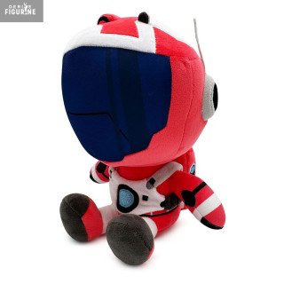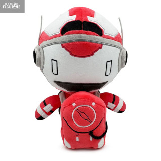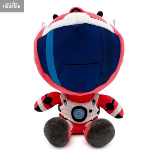 La peluche reproduit fidèlement les traits du personnage : casque bleu profond aux reflets clairs, combinaison rouge et blanche ponctuée de noirs, et module circulaire sur le torse. Les bras et jambes arrondis, le corps compact et le tissu doux respectent un style minimaliste mais expressif. Aucun visage n’est visible derrière la visière, renforçant l’aura mystérieuse de l’explorateur.