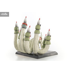 La sculpture en résine donne vie à la créature à neuf queues, chacune surmontée d’une tête de poupée shintoïste au sourire inquiétant, enroulées autour d’un corps élancé d’un blanc spectral. Ninetails se tient en posture d’attaque sur une base effet plancher de temple japonais, tandis qu’un sabre imposant à l’allure céleste prolonge son avancée.