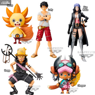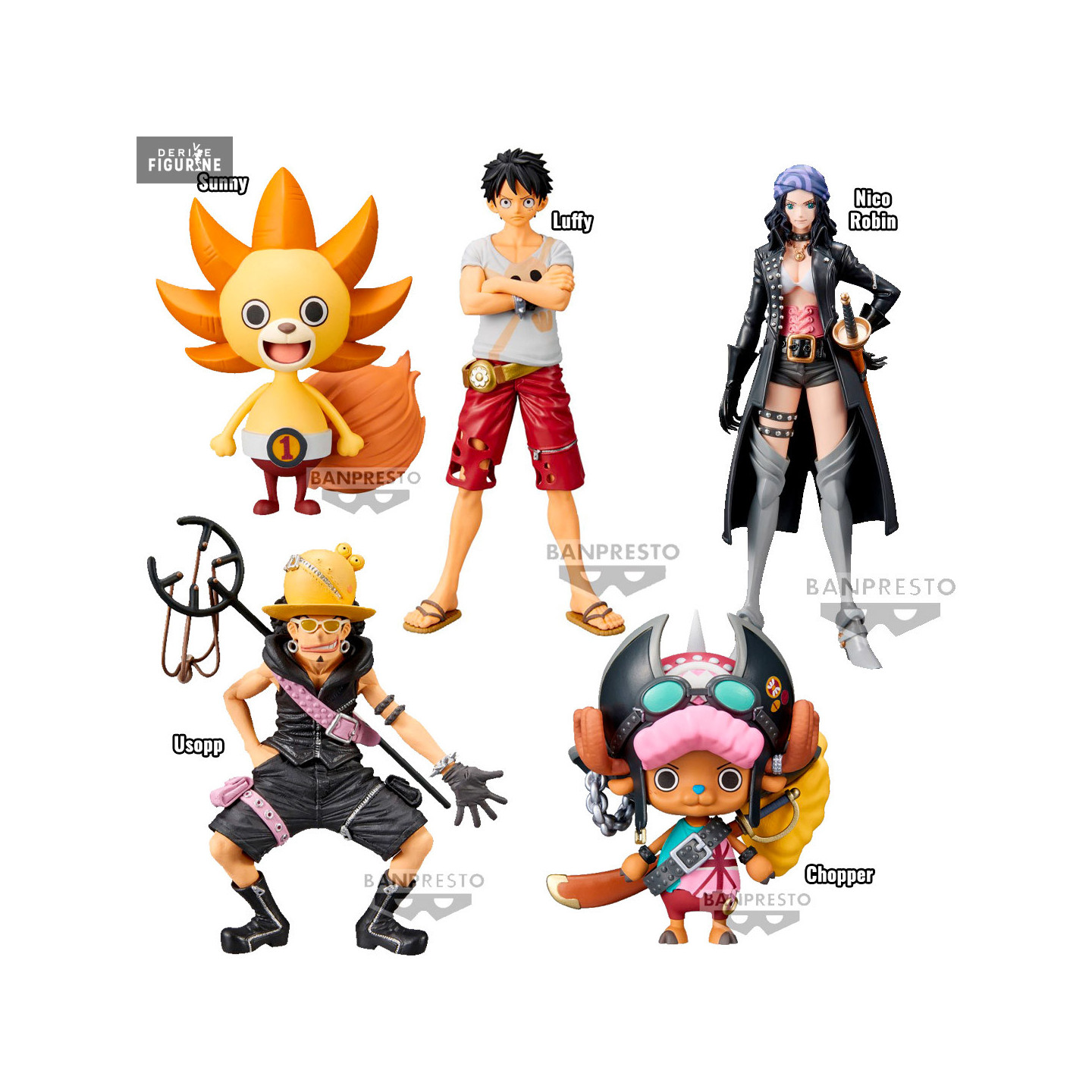 Figurine officielle au choix entre Luffy (~ 16 cm) Nico Robin (~ 17 cm), Sunny (~ ?? cm), Usopp (~ 16 cm) ou Chopper (~ 8 cm) en PVC. Le fabricant est Banpresto.