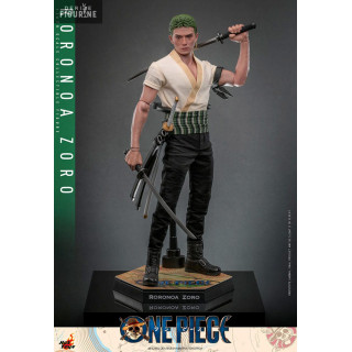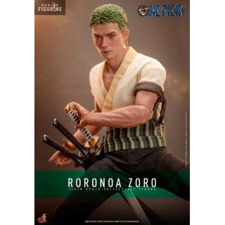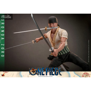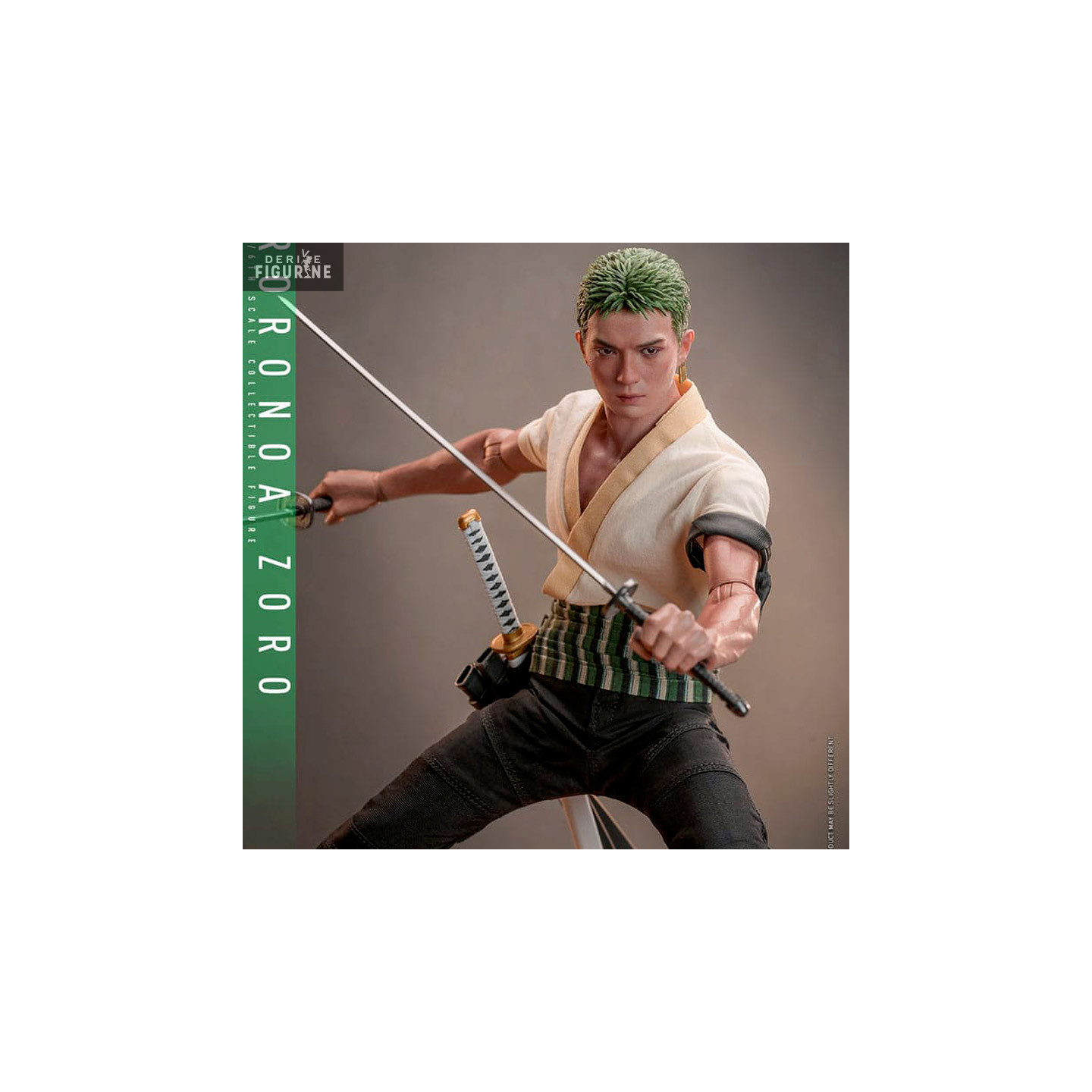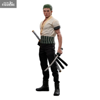 Figurine officielle de Roronoa Zoro mesurant environ 31 centimètres de haut, à l'échelle 1/6. Le fabricant est Hot Toys.