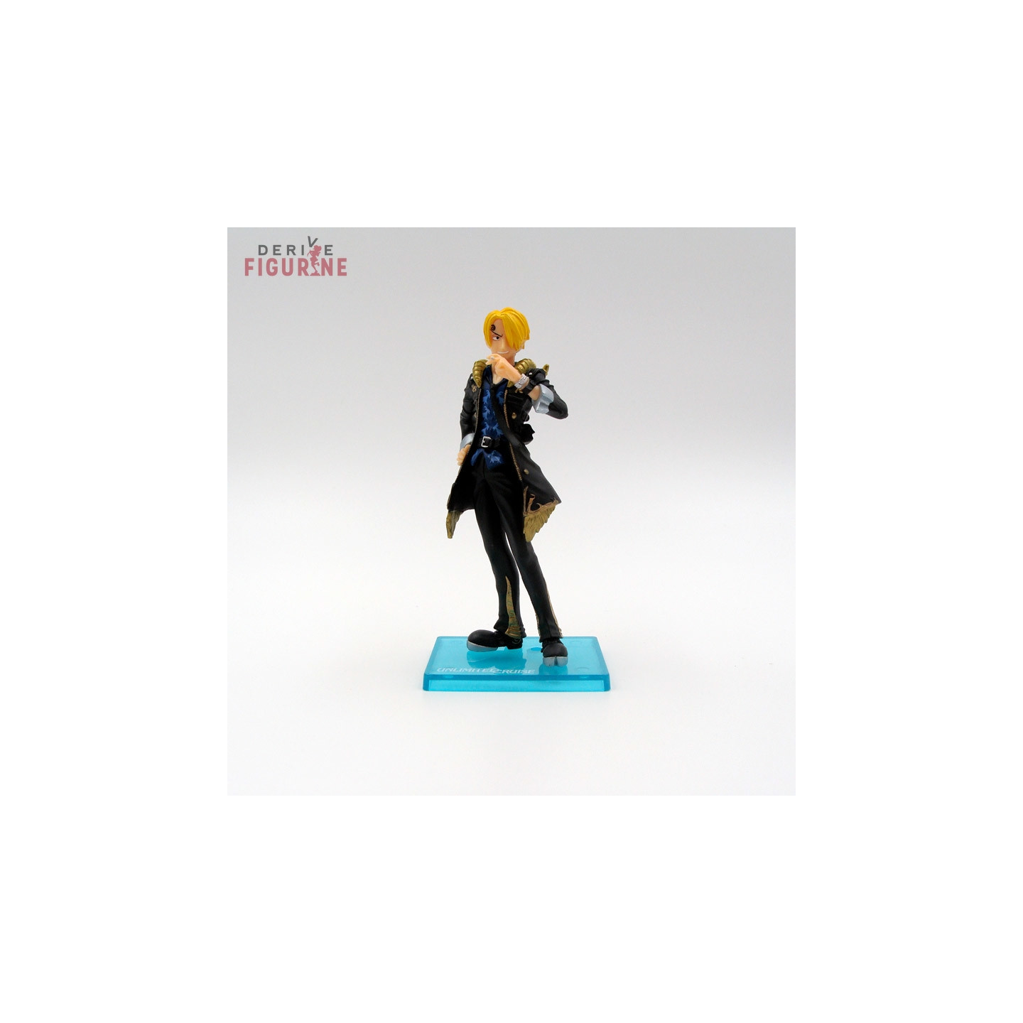 Figurine d'occasion et officielle de Sanji en ABS/PVC d'environ 11,5 centimètres de haut. Sanji est une fois de plus avec une cigarette à la bouche. Il s'agit d'un objet d'occasion en parfait état issu de la collection Unlimited Cruise, mais l'attache est fragilisée. Le fabricant est Bandai, vendu avec boîte en assez bon état.