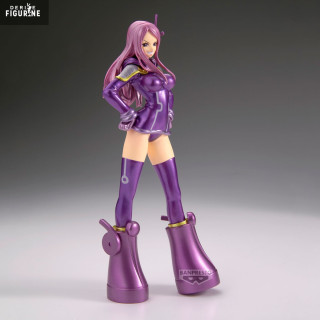 Sur cette figurine “Metallic Version”, Bonney arbore une combinaison violette métallisée inspirée de sa tenue d’infiltration à Egg Head. Ses cuissardes oversize, ses gants et son haut moulant sont traités d’un vernis brillant qui capte la lumière. Ses longs cheveux roses tombent en cascade, et son sourire confiant, accentué par un regard malicieux, reflète son caractère audacieux.