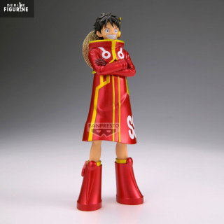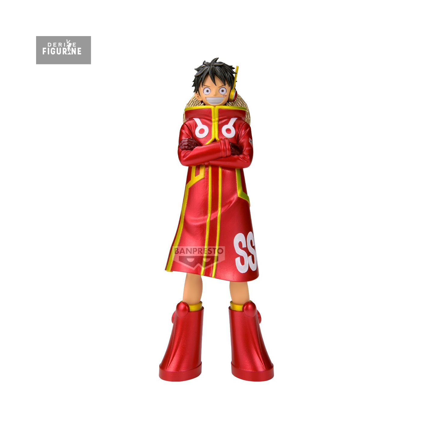 Figurine officielle de Monkey D. Luffy, Egg Head (Metallic) en PVC mesurant environ 16 centimètres de haut. Elle est issue de la collection DXF Grandline Series. Le fabricant est Banpresto.