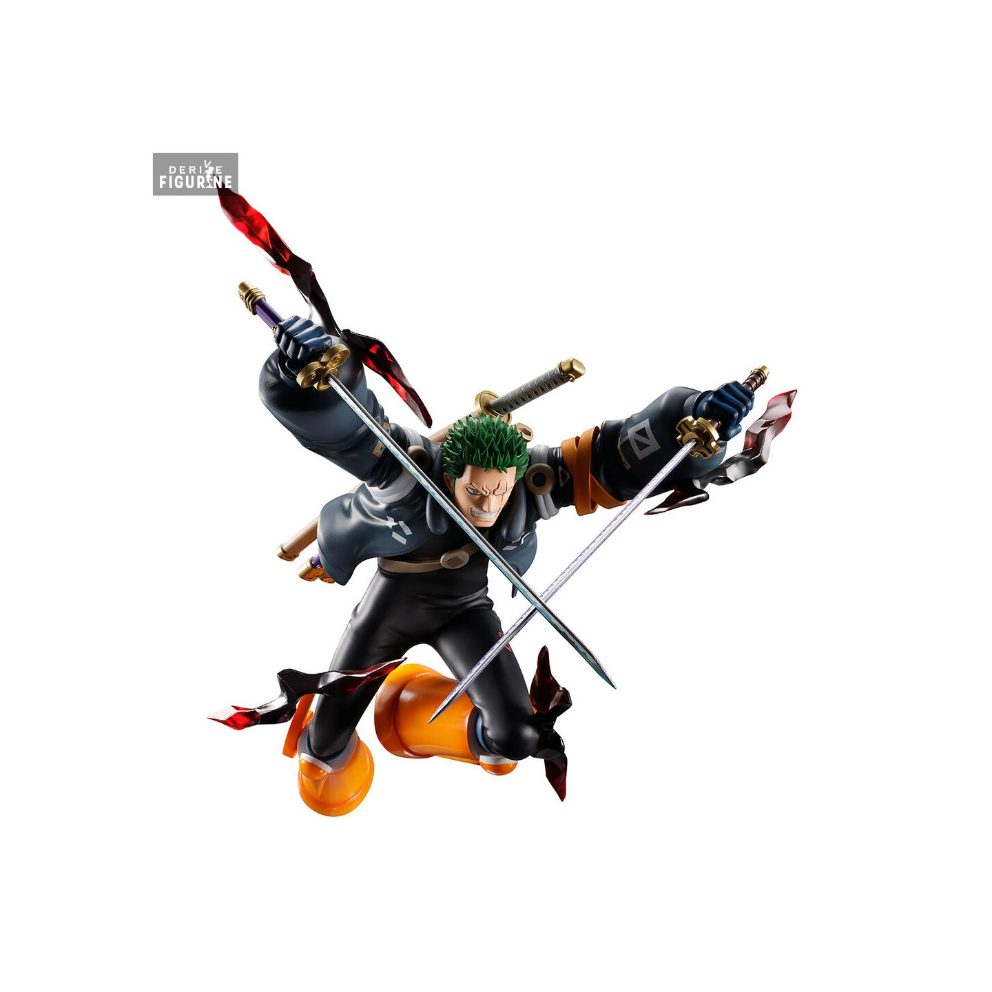 Les détails du design mettent en valeur son apparence caractéristique : cheveux verts hérissés, bandeau attaché à son bras, et tenue sombre qui met en contraste l’éclat métallique de ses lames. Les effets rouges stylisés autour de ses sabres accentuent la puissance de son assaut, comme s’ils matérialisaient l’énergie dégagée par son coup.