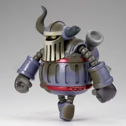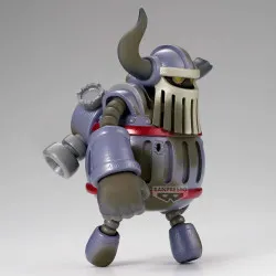 Visuellement, on voit un robot trapu au corps en forme de tonneau, dans des tons gris/bleu métallisé, avec deux anneaux rouges qui encerclent le buste. La tête est protégée par un casque sombre surmonté d’un bandeau, flanqué de deux grandes cornes latérales, et une grille verticale devant le visage laisse apparaître des yeux jaune pâle. Les bras sont reliés par des segments type soufflets et se terminent par de gros gantelets cylindriques, mains fermées, tandis que les jambes courtes finissent sur des pieds arrondis. On distingue aussi de petites marques et impacts sculptés sur l’armure, et sa pose bien campée la rend simple à exposer.