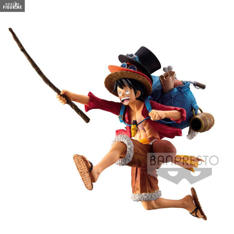Luffy est toujours aussi enjoué, et cette fois, on dirait qu'il est prêt pour partir en vacance avec un bâton de marche, un sac à dos hyper chargé. Il a aussi son chapeau sur la tête, mais pas seulement car il a aussi celui de Ace et celui de Sabo.