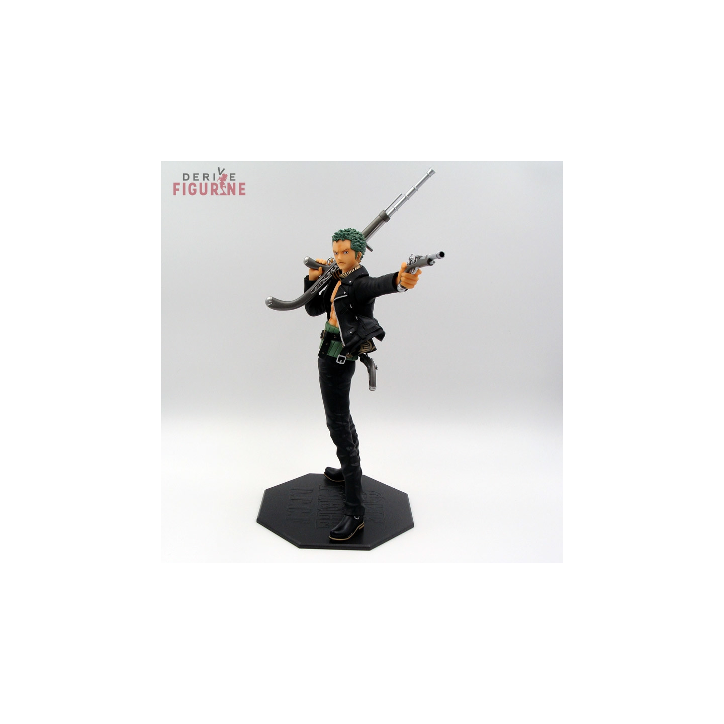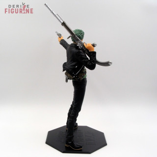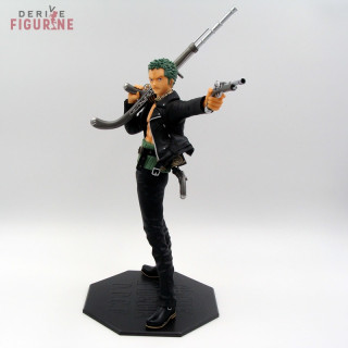 Avant de rejoindre l'équipage de Luffy, Roronoa Zoro était un chasseur de pirate et il était reconnu pour son maniement des sabres et plus précisément, sa technique est connue pour sa maîtrise du combat en maniant trois sabres à la fois. Cette figurine tirée d'une illustration en compagnie de Luffy et Sanji lui permet de changer ses sabres pour des pistolets de mousquetaire.