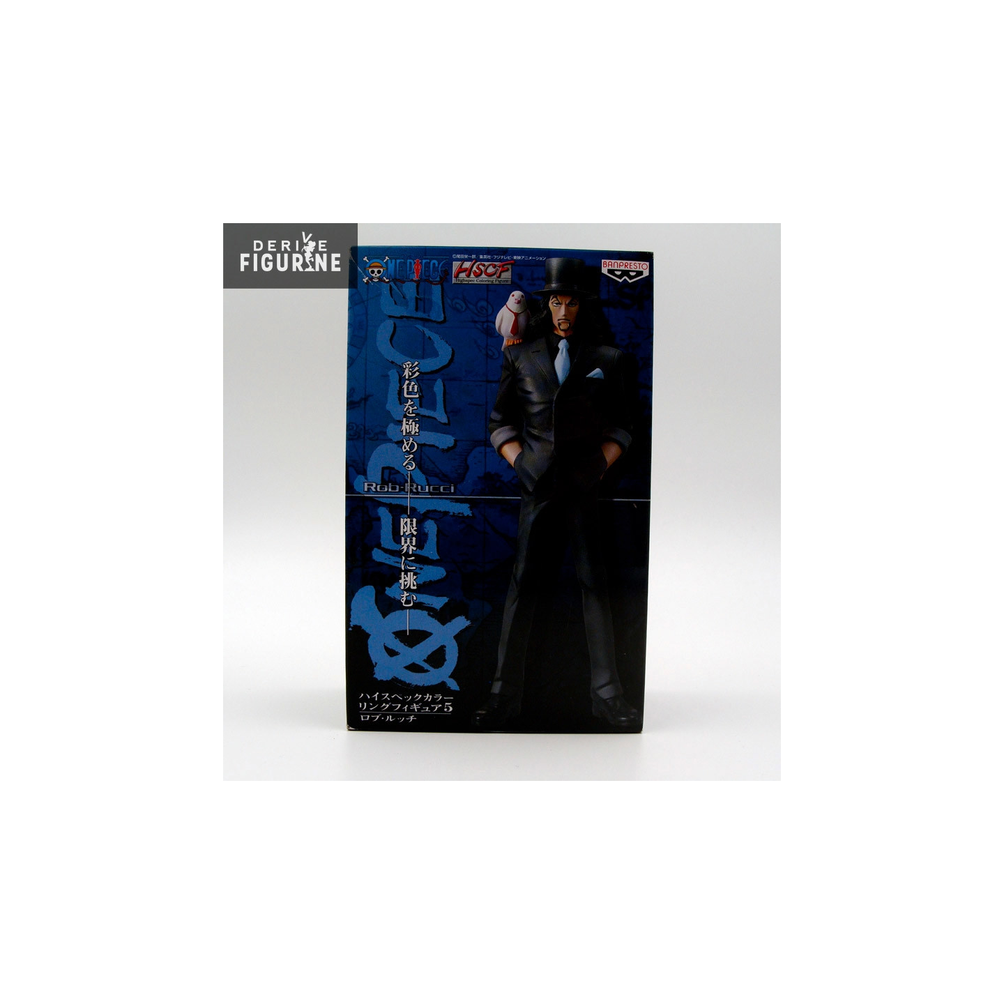 Figurine officielle de Rob Lucci et Hattori en PVC d'environ 12 centimètres de haut, issue de la collection High Spec Coloring Figure Vol.5. Rob pose les mains dans les poches avec Hattori sur son épaule. Le fabricant est Banpresto.