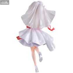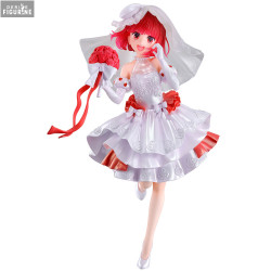 Cette figurine la représente dans une sublime tenue de mariée, à l’esthétique festive et raffinée. Kana porte une robe blanche à plusieurs volants, ornée de broderies en relief et doublée d’un tissu rouge satiné. Un large nœud rubis marque sa taille, et elle tient dans sa main un bouquet sphérique de roses rouges, attaché par un long ruban. Son voile décoré de motifs floraux s’accorde parfaitement à son sourire lumineux et à sa posture dynamique.