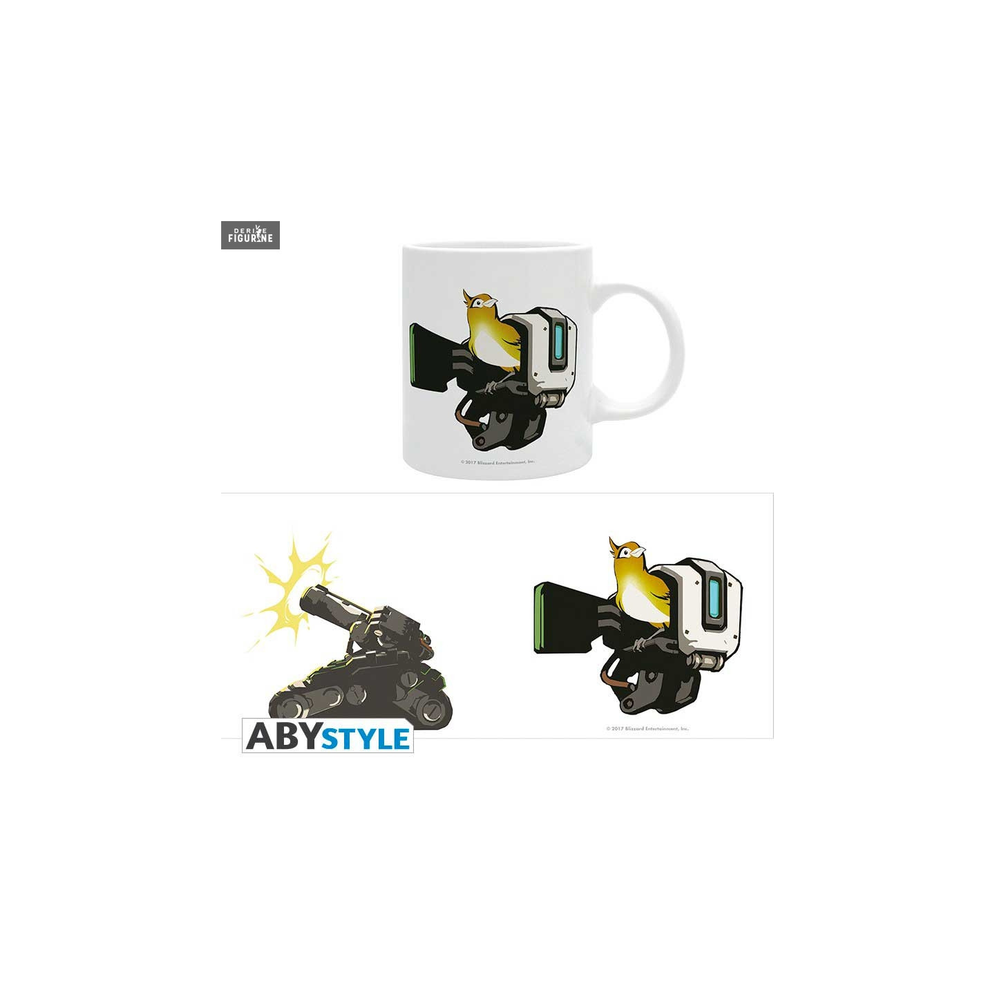 Bastion est un personnage d'Overwatch qui peut aussi bien utiliser ses compétences de reconnaissance, de sentinelle que s'auto réparer. Comme vous pouvez le voir sur l'une des faces du mug, il peut aussi se transformer en tank lorsqu'il déclenche son ulti. Il est aussi souvent accompagné d'un petit oiseau.
