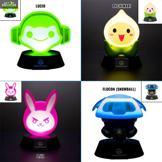 Veilleuse officielle au choix entre Lucio, Pachimari, Flocon (Snowball) ou D.Va, mesurant environ 10 centimètres de haut. Nécessite deux piles AAA (non fournies). Le fabricant est Paladone.