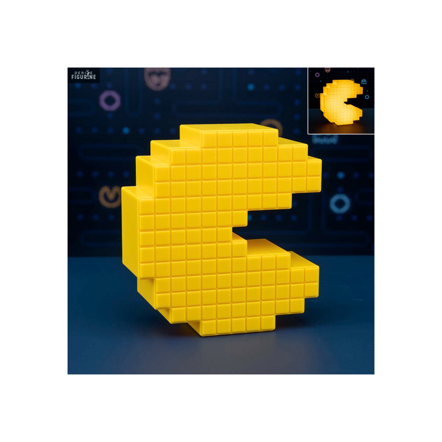 Lampe officielle de Pac-Man mesurant environ 15 centimètres. Elle fonctionne avec 2 piles AAA (non incluses). Le fabricant est Paladone.