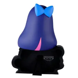 Visuellement, Stocking est représentée en version chibi, assise, les jambes tendues vers l’avant, en serrant une petite peluche violette contre elle. Elle a de très longs cheveux violets foncés avec des mèches roses, qui forment comme deux pointes au sommet, et un intérieur de chevelure rose visible autour du visage. Son regard est accentué par de grands yeux bleu clair et une petite bouche entrouverte. Elle porte une robe noire avec un col blanc et un petit nœud bleu, une jupe blanche, de grosses chaussettes rayées bleu et noir et des chaussures noires. L’ensemble est installé sur un support façon panneau noir et violet, avec le nom “STOCKING” et “GARTERBELT” visibles, plus un macaron “NEW”, ce qui donne un vrai petit décor prêt à exposer.