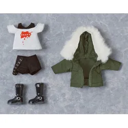 Visuellement, on retrouve son style reconnaissable : cheveux orange coupés au carré avec frange, grandes lunettes rondes et un gros casque audio noir sur les oreilles. Elle porte une parka verte ouverte avec une capuche bordée de fausse fourrure blanche, par-dessus un haut blanc avec un motif rouge façon pixel-art, un short noir, et de grosses bottes noires. La seconde photo montre aussi les vêtements séparés (haut, short, manteau et chaussures), pratique pour varier un peu la présentation sans sortir du look “Futaba” de base.