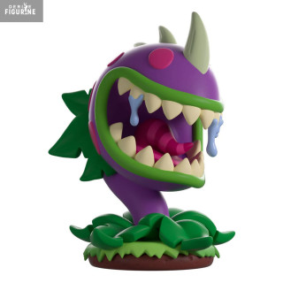La figurine en vinyle met en valeur son look déjanté : une tête massive violette aux contours verts, deux grandes cornes grises sur le dessus, et une gueule béante remplie de dents pointues. Des filets de bave bleue dégoulinent de ses crocs, accentuant son appétit vorace. Sa langue rose serpente à l’intérieur de sa bouche. Il est planté sur une base verte en forme de feuillage, fidèle au style visuel du jeu.