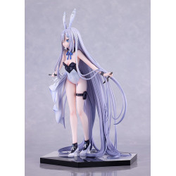 Visuellement, on voit de très longs cheveux lavande qui tombent jusqu’au sol en plusieurs mèches épaisses, avec une frange droite et une longueur qui s’étale autour des jambes. Elle porte des oreilles de lapin blanches sur la tête, un petit nœud bleu au cou, et un haut noir type bustier/corset avec des détails de matière brillante. Le bas contraste avec une pièce blanche à volants qui forme une sorte de jupe asymétrique et de traîne sur le côté, plus une lanière noire façon jarretière sur une cuisse. Aux pieds, elle porte des chaussures hautes noires et blanches, et l’ensemble repose sur une base noire à pans droits.