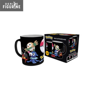 Voici un mug thermosensible Pokémon. Le mug est noir avec une pokéball et Pokémon inscrit en jaune. Une fois le mug rempli de boisson chaude, le mug laissera apparaître Brindibou, Flamiaou et Otaquin, les pokémons starters des jeux « Pokémon soleil et lune ».