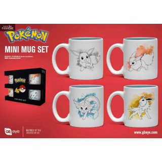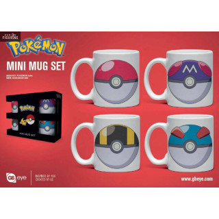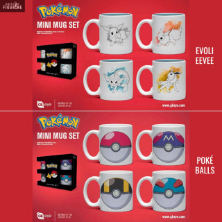Pack officiel 4 tasses Espresso Pokémon Evoli évolutions ou Poké Balls en céramique qui a une contenance de 15 cl. Le fabricant est GB Eye.