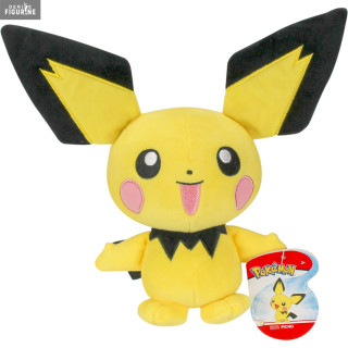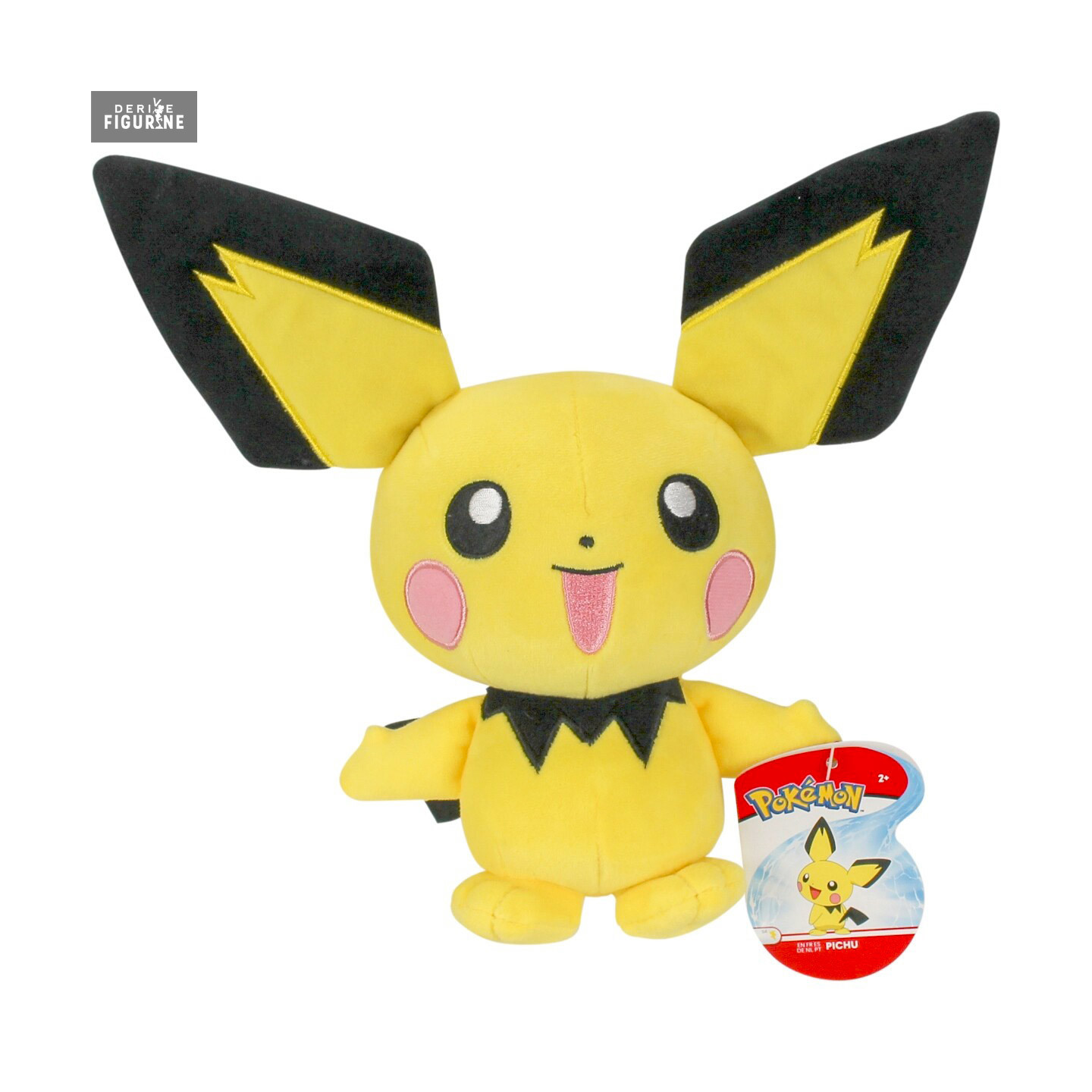 Peluche officielle de Pichu mesurant environ 20 centimètres de haut. Le fabricant est BOTI.