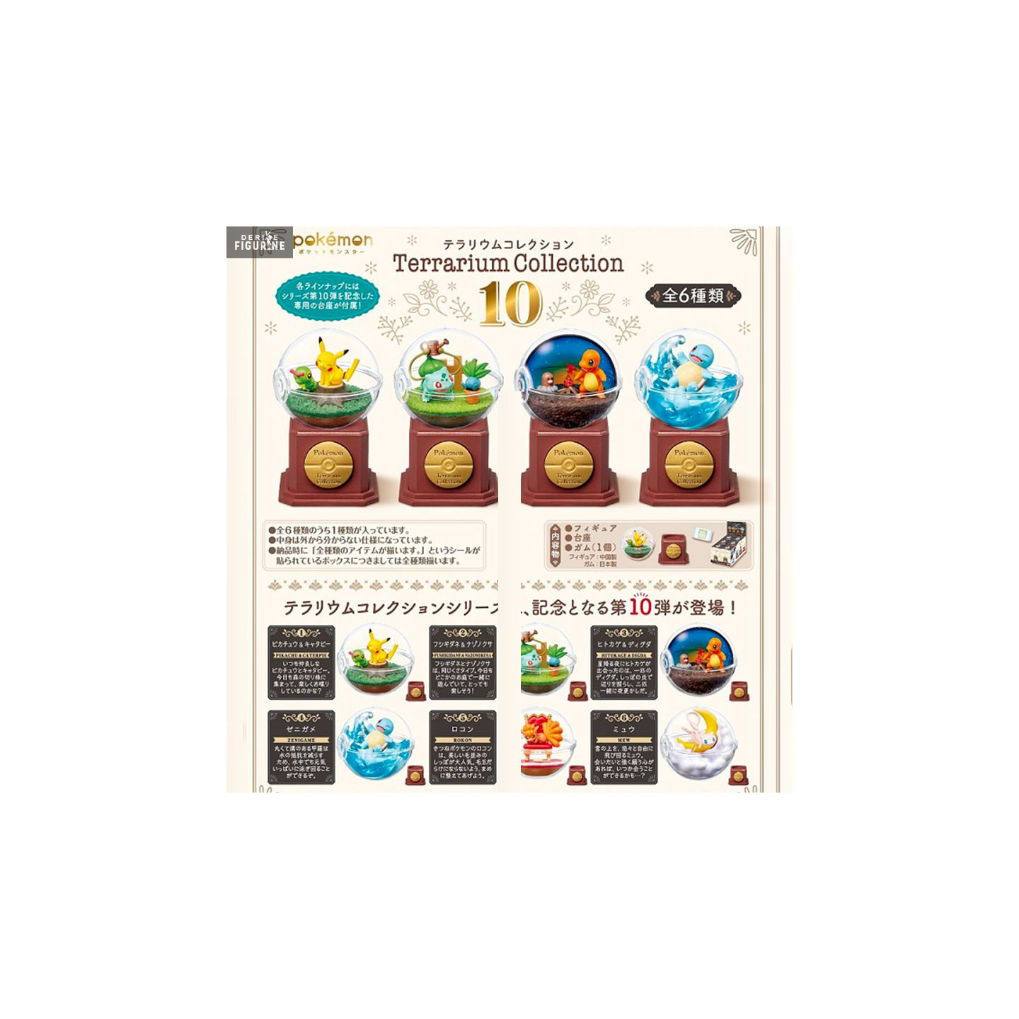 Vous allez avoir une chance d'obtenir une figurine aléatoire Pokémon du volume 10 de la collection Terrarium. Le line up est composé de Pikachu avec Chenipan, Bulbizarre et Mystherbe, Salamèche et Taupiqueur, Carapuce, Mew et Goupix.