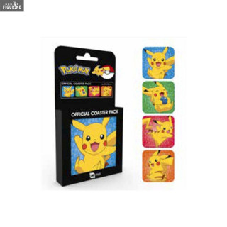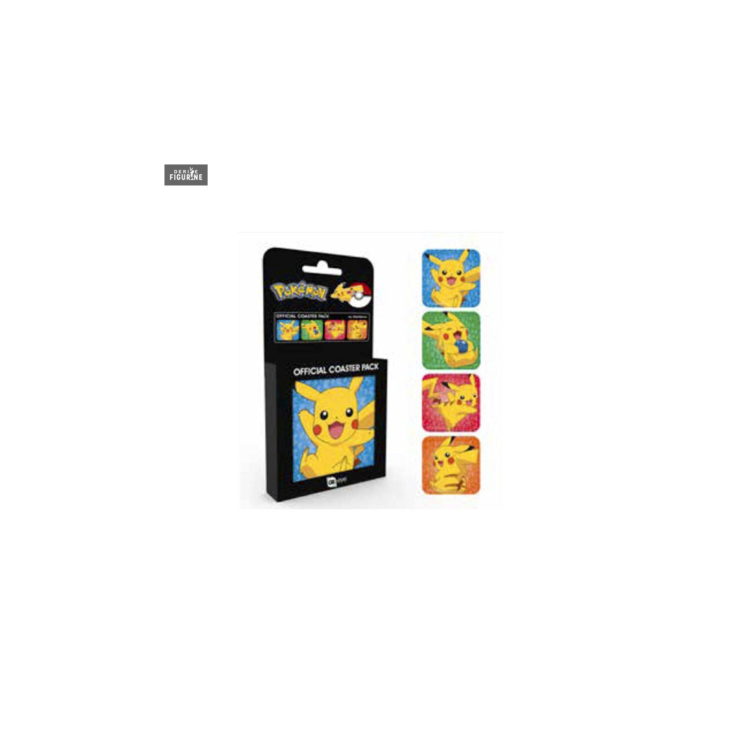 Set de quatre dessous de verre Pokémon représentant différents Pikachu qui mesurent environ 10 centimètres de haut. Le fabricant est GB Eye.