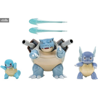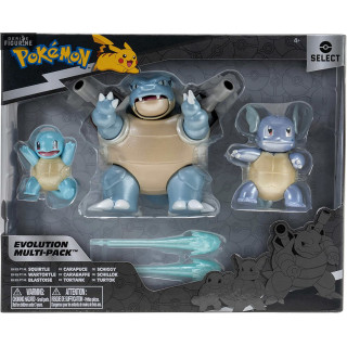 Pokémon propose ce pack comprenant les trois évolutions du tout mignon Carapuce et vous aurez donc trois figurines : Carapuce, Carabaffe & Tortank pour la collection des Select Evolution Multipack. Ces Pokémon de type eau ont été découverts très rapidement par Sasha dans l'anime et on les a beaucoup vu comme étant les pompiers aidant les humains et Pokémon contre les incendies.