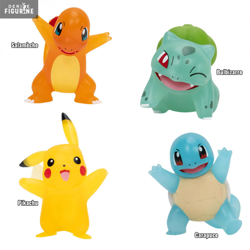 Figurine officielle de Bulbizarre, Pikachu, Carapuce ou Salamèche (transparent) or complete pack mesurant environ 7,5 centimètres de haut. Le fabricant est Jazwares.