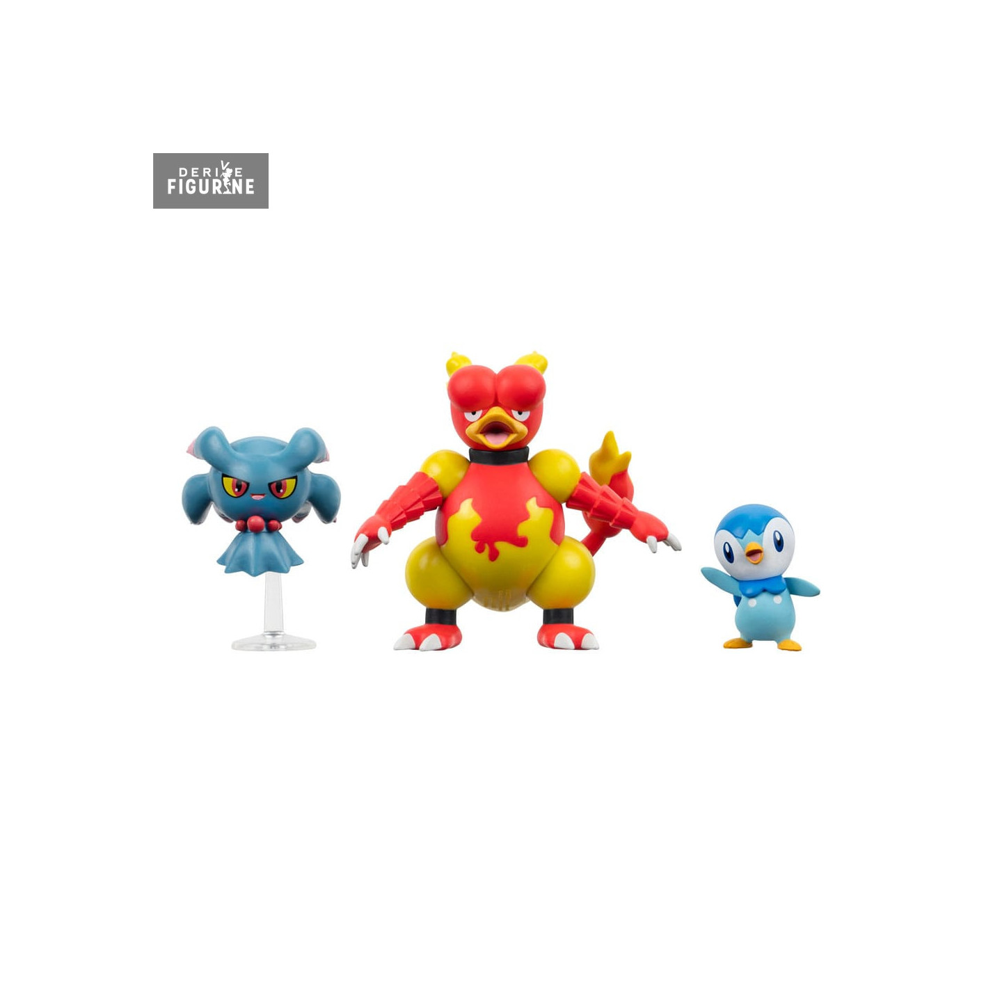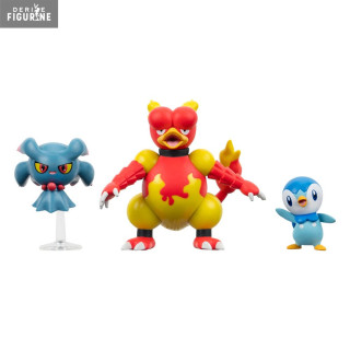 Figurines officielles de Tiplouf, Feuforêve, Magmar mesurant environ 5 centimètres de haut. Elles sont issues de la collection Battle Figure. Le fabricant est Jazwares.