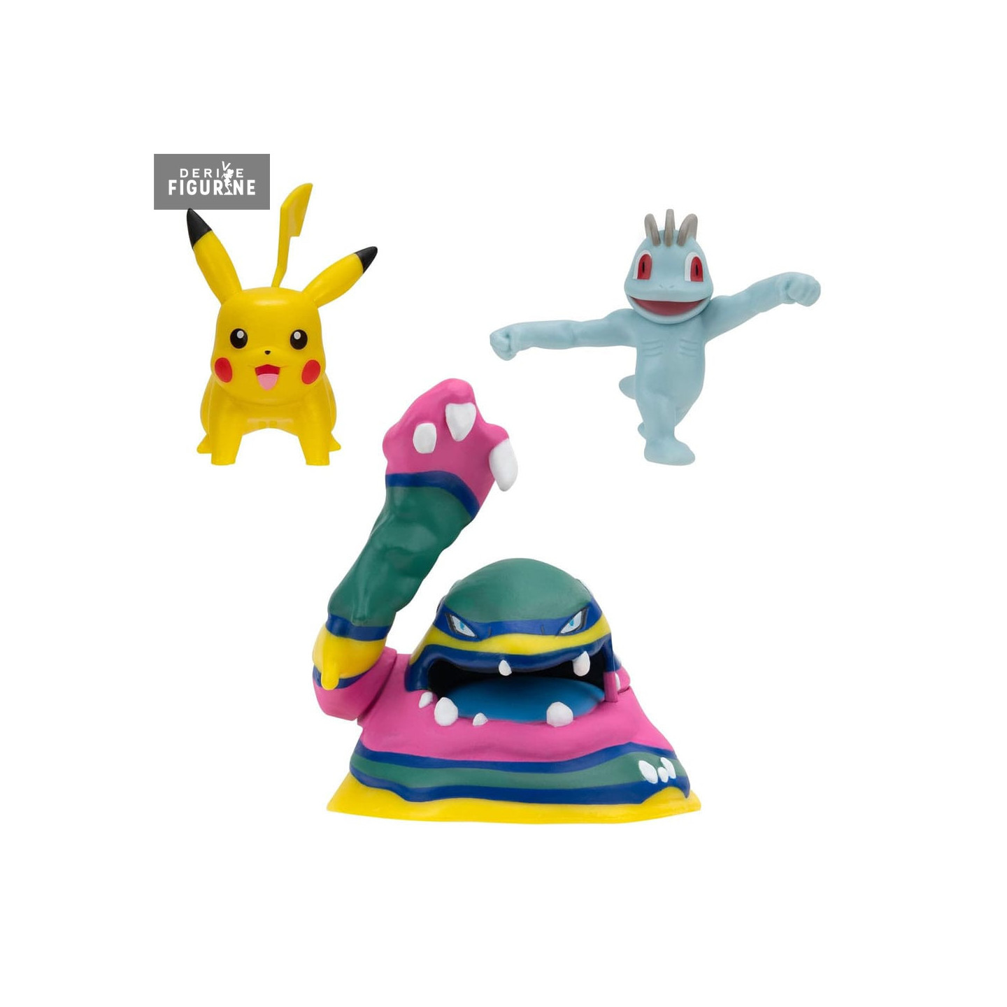 Figurines officielles de Machoc, Pikachu Ver.1, Alola Grotadmorv mesurant environ 5 centimètres de haut. Elles sont issues de la collection Battle Figure. Le fabricant est Jazwares.