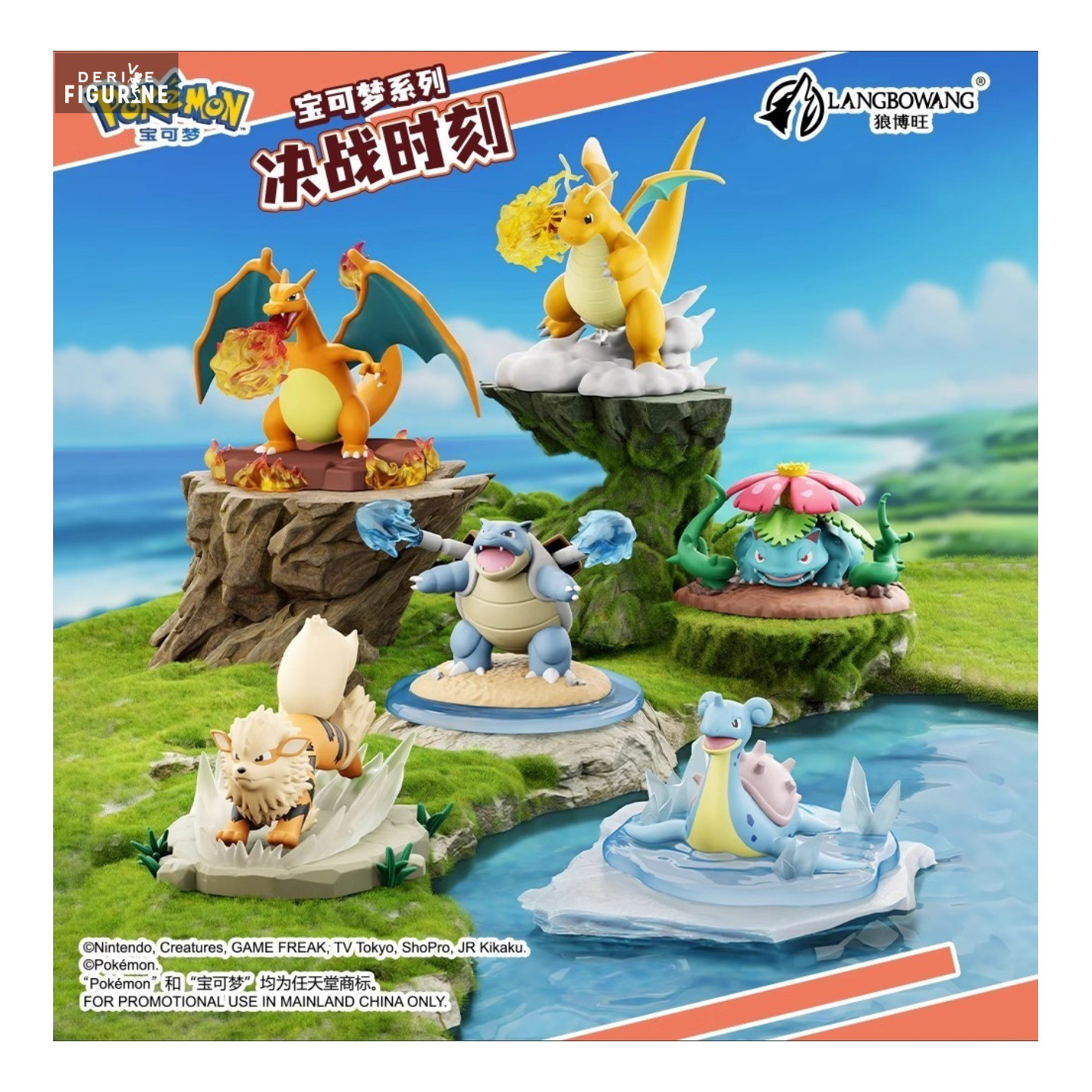 Figurines officielles de Pokémon en PVC mesurant environ 6,5 à 10,5 centimètres de haut. Elles sont issues de la collection Battle Moment Ornaments. Le fabricant est Langbowang.