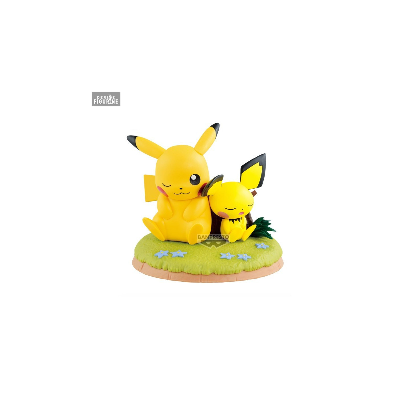 Fabriquée par Banpresto, cette figurine en PVC mesure environ 11 centimètres de haut et représente les deux Pokémon assis paisiblement sur un socle herbeux décoré de fleurs. Pikachu arbore un sourire doux et un clin d'œil affectueux, tandis que Pichu semble paisiblement endormi à ses côtés. Les finitions de la figurine mettent en valeur les détails caractéristiques des deux personnages, notamment les joues rouges de Pikachu et les grandes oreilles de Pichu. Idéale pour les collectionneurs de Pokémon, cette figurine évoque un sentiment de sérénité et de complicité, parfait pour ajouter une touche de douceur à toute collection.