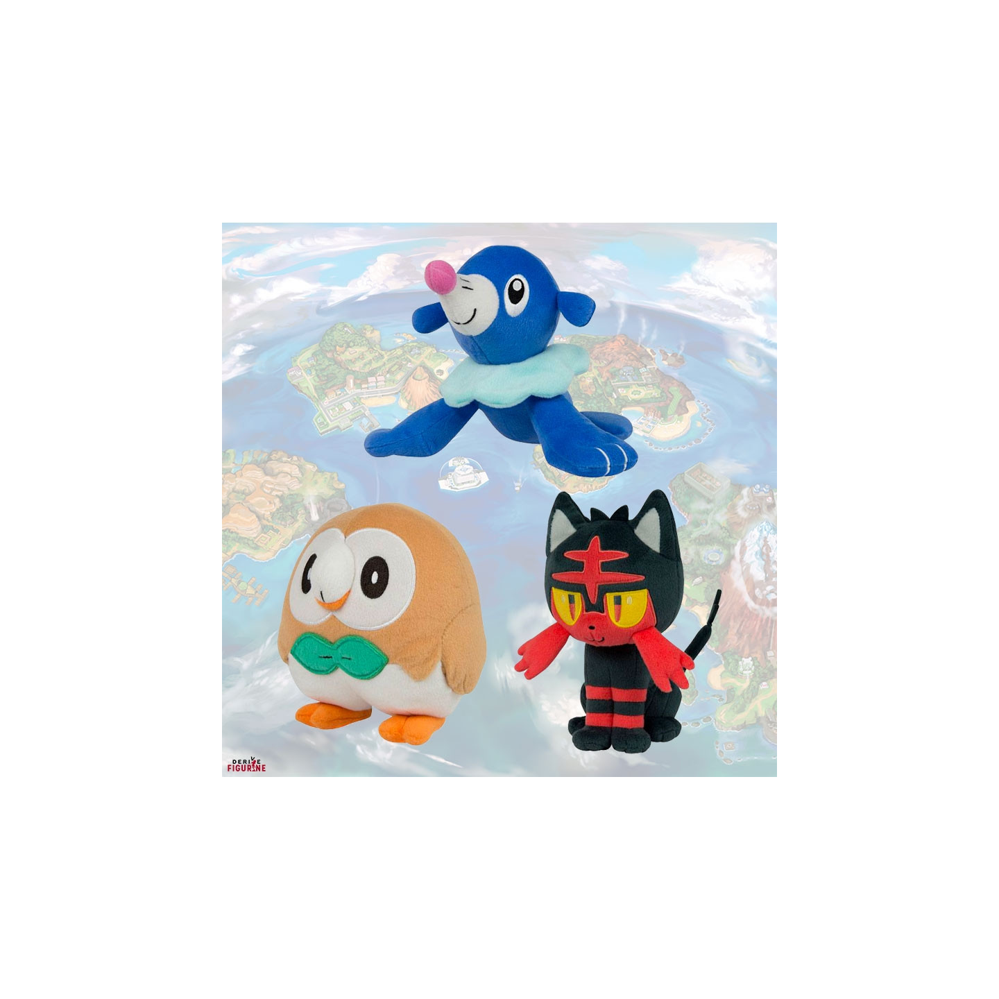 Voici trois peluches qui représentent les trois Pokémon que vous pouvez choisir en début de partie dans Pokémon Soleil et Lune. Il y a donc Otaquin, Brindibou et Flamiaou, et comme dans le jeu, il va falloir choisir celle que vous voulez parmi les trois, sauf si bien sûr vous les prenez toutes.