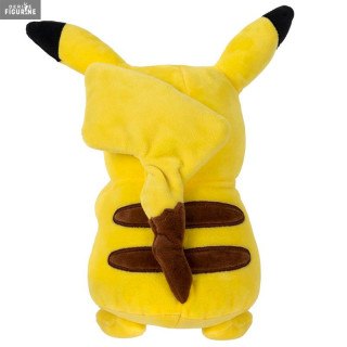 Peluche officielle de Pikachu mesurant environ 20 centimètres de haut. Le fabricant est BOTI.