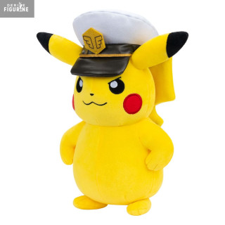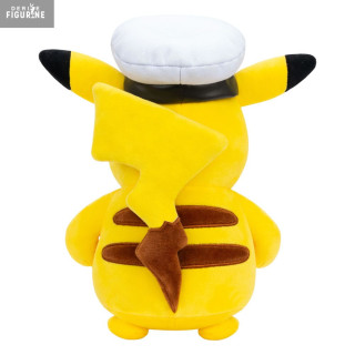 Peluche officielle de Captain Pikachu mesurant environ 20 centimètres de haut. Le fabricant est Jazwares.