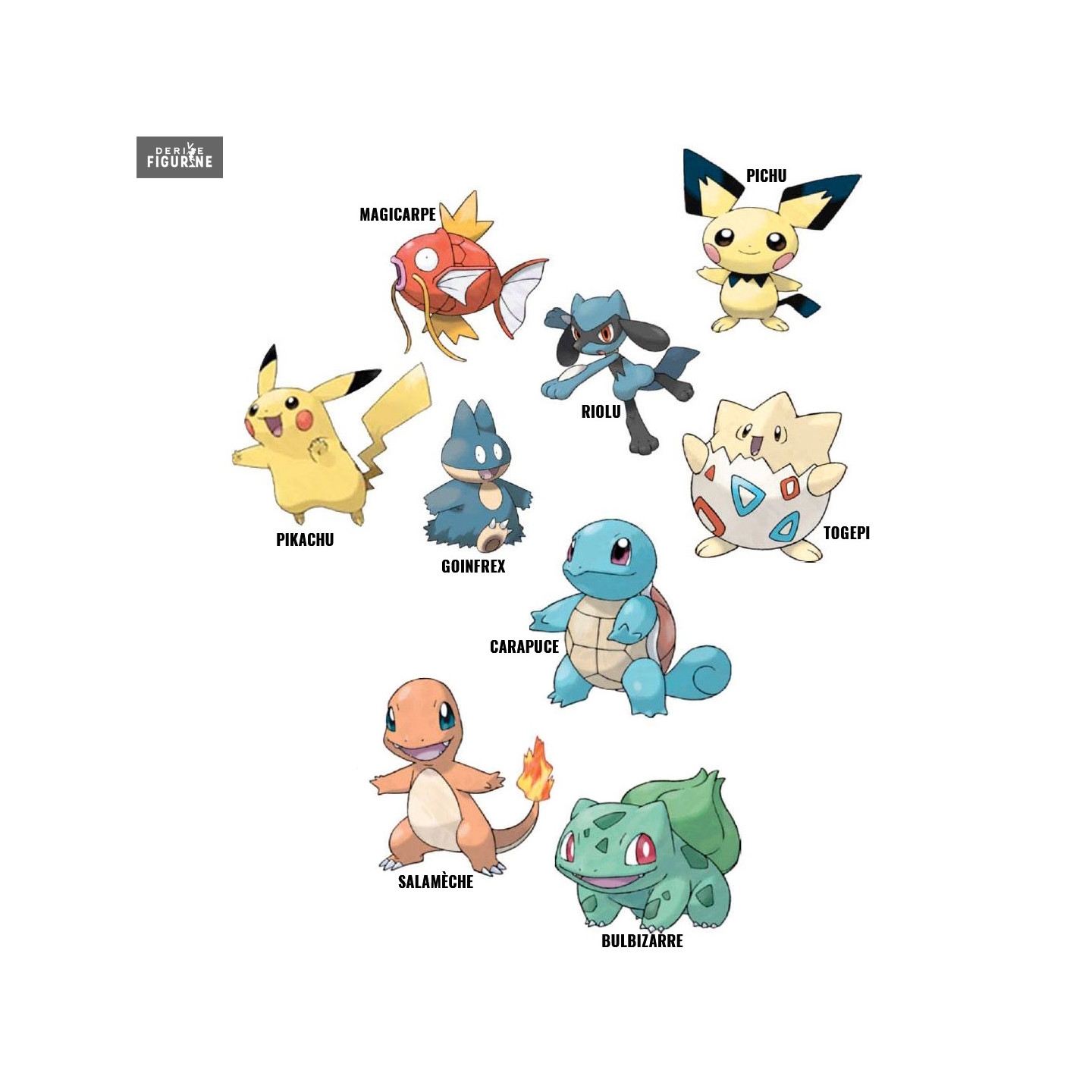 Peluche officielle au choix entre Pikachu, Salamèche, Carapuce, Bulbizarre, Pichu, Goinfrex, Magicarpe, Togepi ou Riolu mesurant environ 20 centimètres de haut. Le fabricant est BOTI.