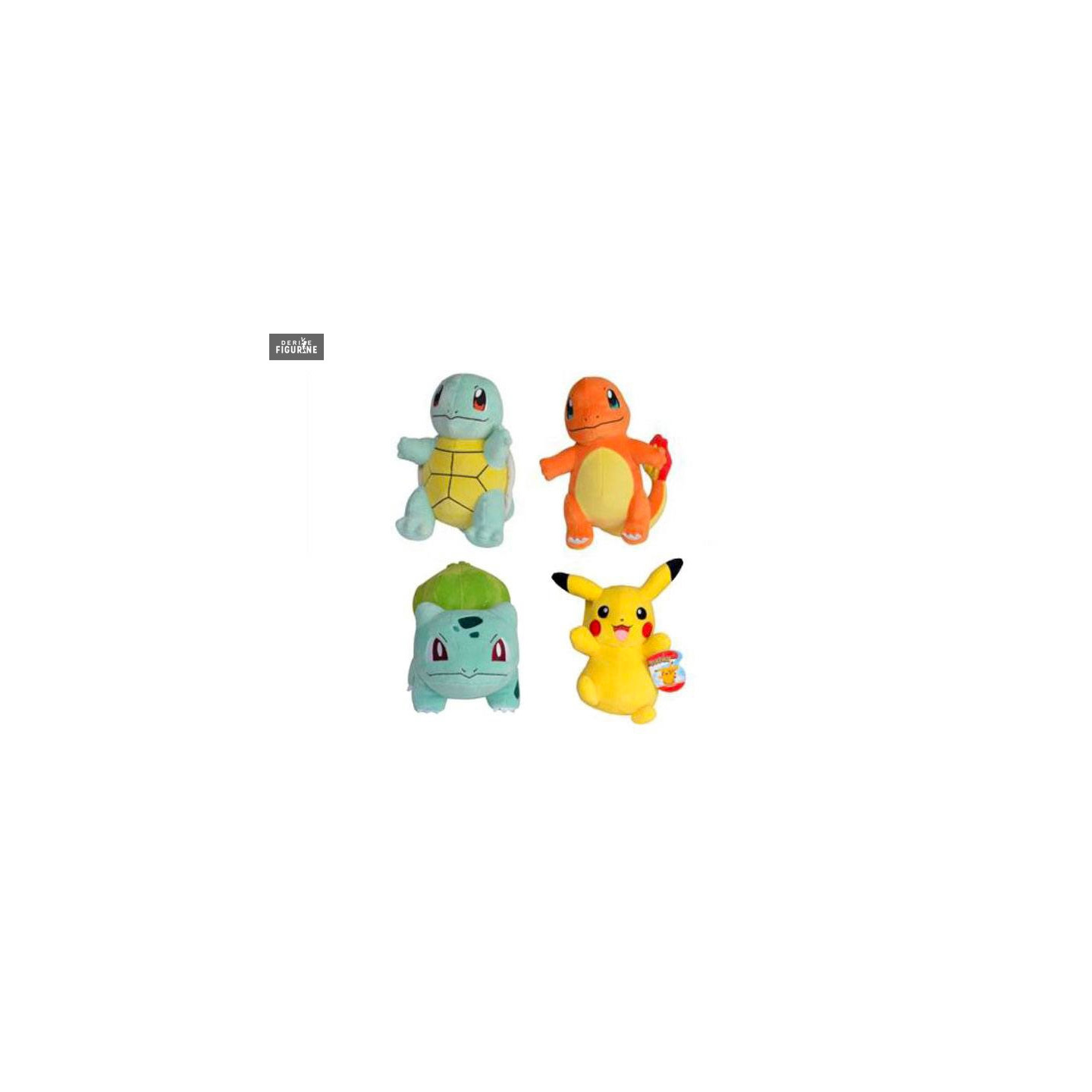 Peluches officielles de Pikachu, Salamèche, Carapuce et Bulbizarre mesurant environ 20 centimètres de haut. Le fabricant est BOTI.