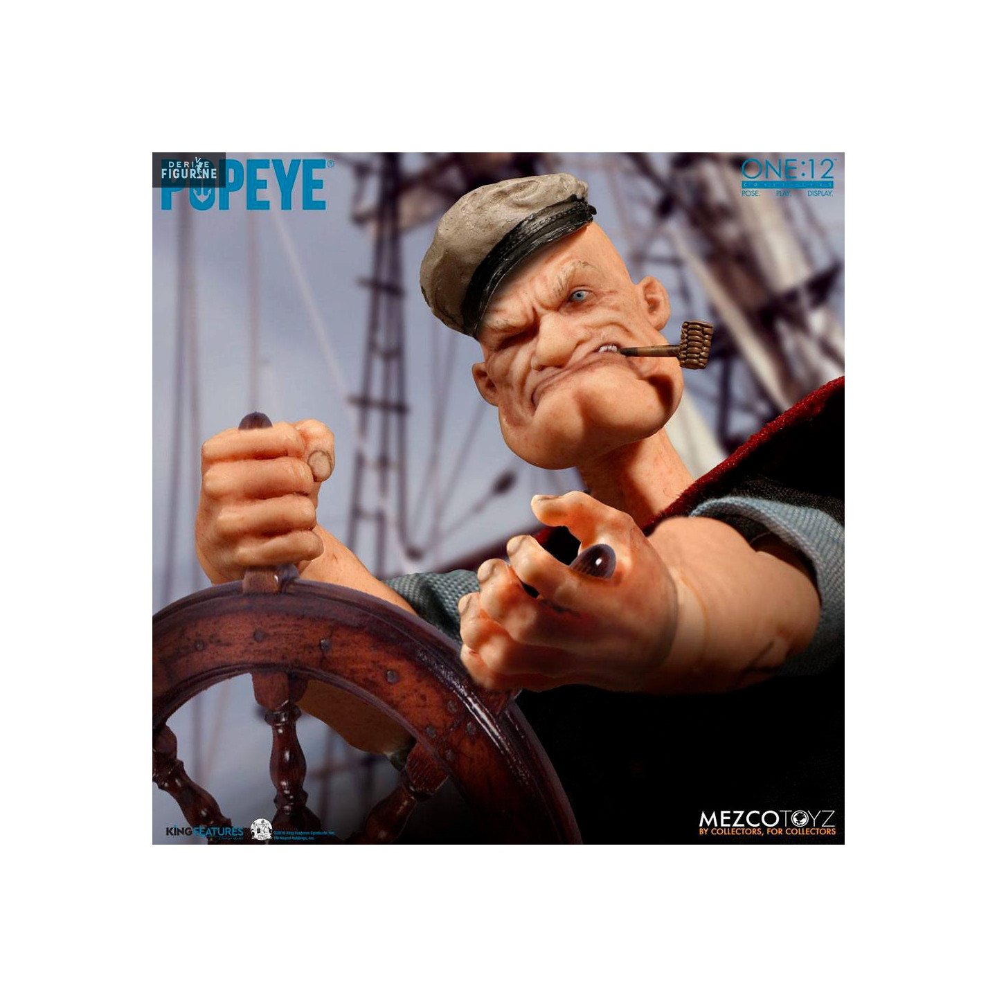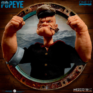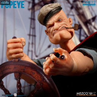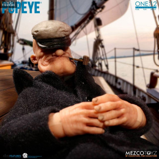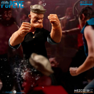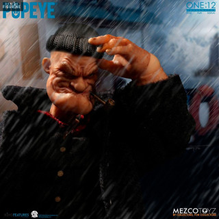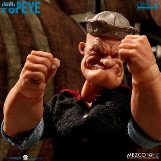 Figurine officielle de Popeye en PVC mesurant environ 14 centimètres de haut, à l'échelle 1/12. Elle est issue de la collection One:12. Le fabricant est Mezco Toys.