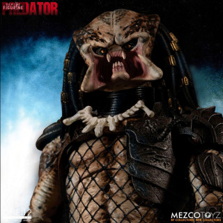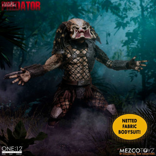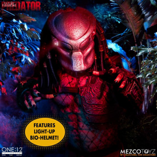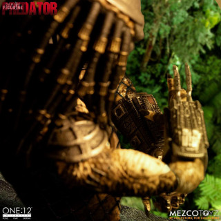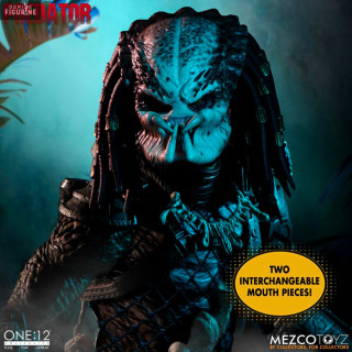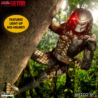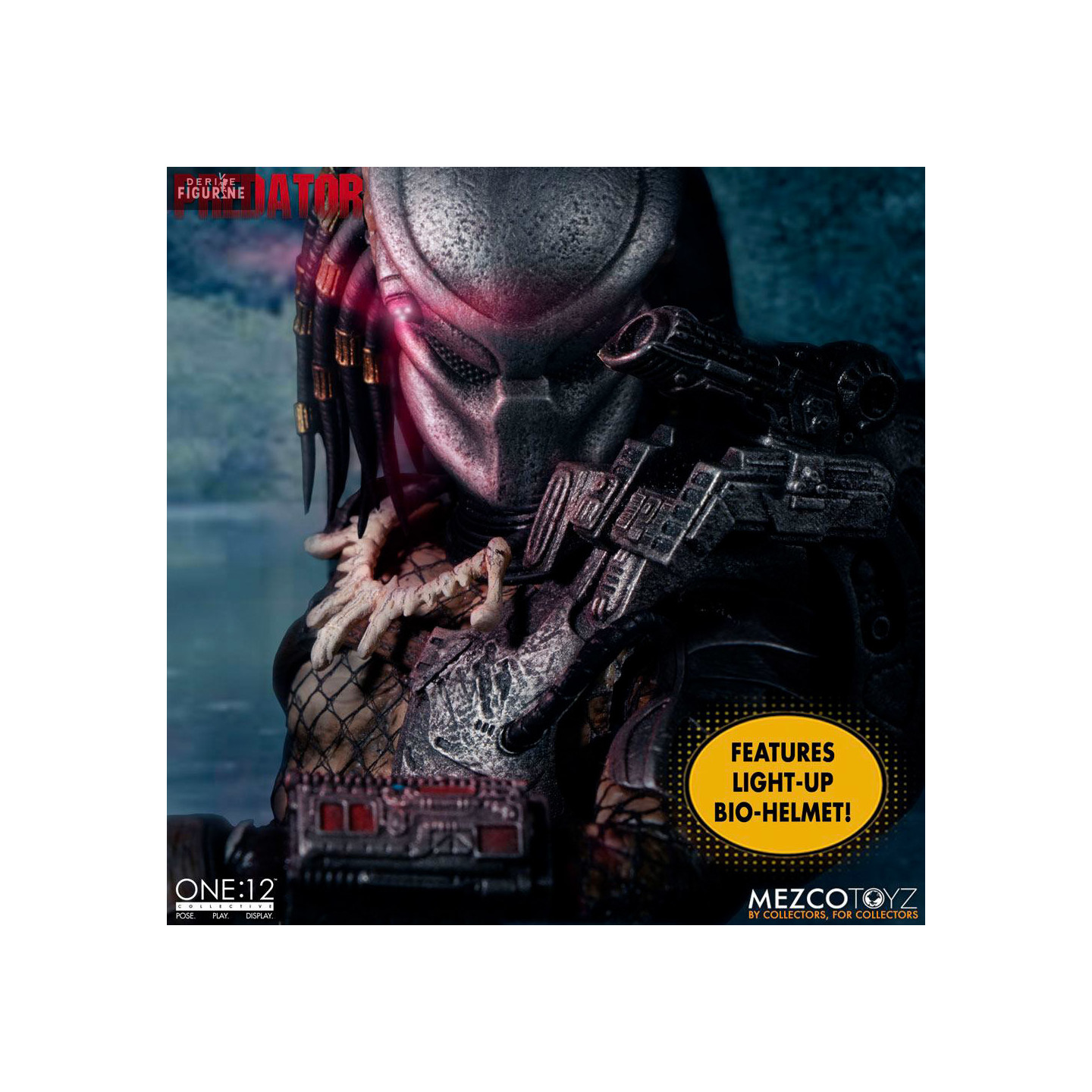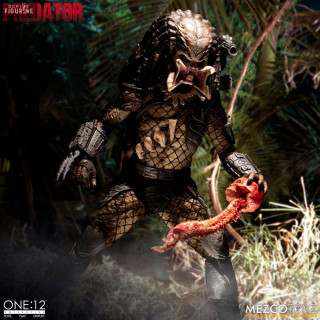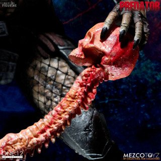 Figurine officielle de Predator mesurant environ 17 centimètres de haut, à l'échelle 1/12. Elle est issue de la collection One:12. Le fabricant est Mezco Toys.
