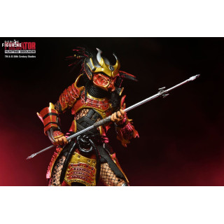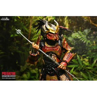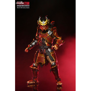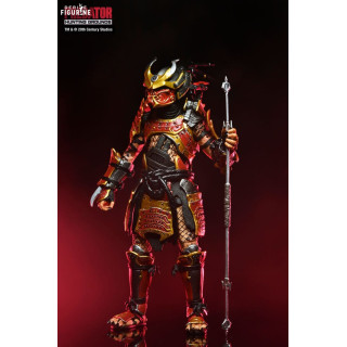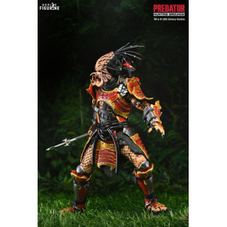 Le Yautja se présente ici en armure complète de samouraï, ornée de dorures, de rouge sang et de gravures inspirées des kabutos les plus intimidants. Son casque, fusion entre technologie alien et masque démoniaque, est amovible et laisse apparaître une mâchoire terrifiante. Il est équipé comme il se doit : sabres, lames, shurikens et lances de chasse retravaillées dans un style martial aussi classe que létal.
