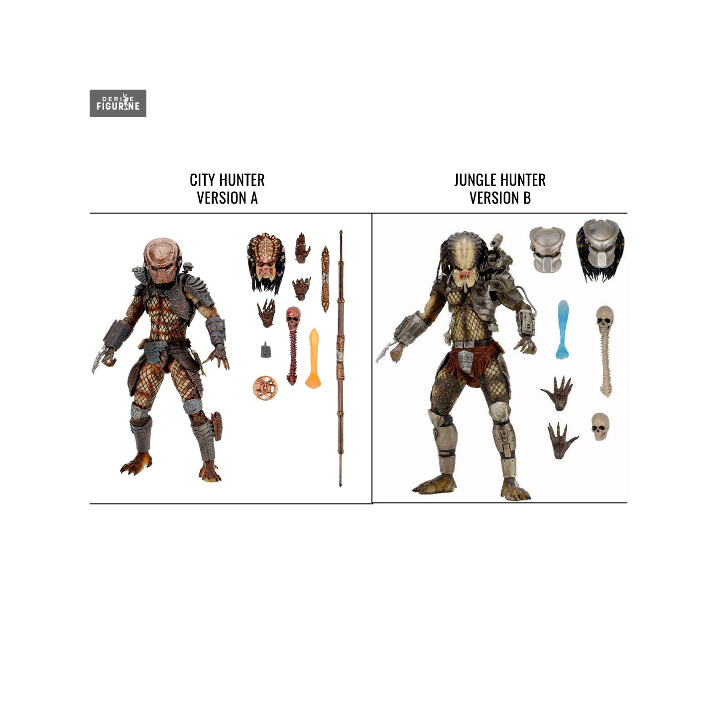 Vous avez deux options qui s'offrent à vous pour ces figurines de prédator. D'une part nous avons le City Hunter (Version A) et face à lui se trouve le Jungle Hunter (Version B). Chacun d'entre eux est vendu avec des accessoires et est articulé.